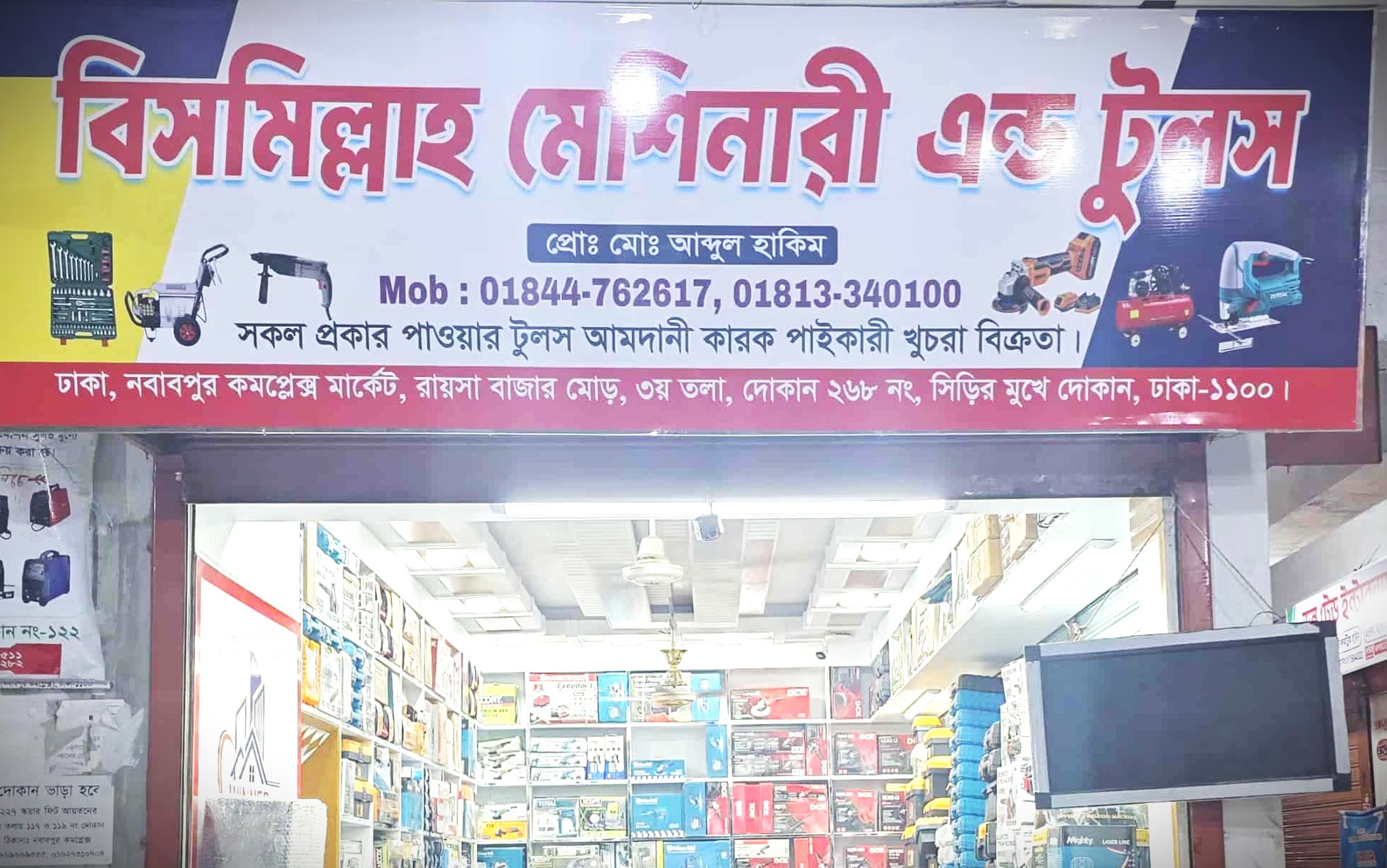 ঢাকা, নবাবপুর, রায়সা বাজার মোড়, নবাবপুর কমপ্লেক্স মার্কেট, ৩য় তলা সিঁড়ির মুখে দোকান, দোকান নং 107, দোকানের নাম: বিসমিল্লাহ মেশিনারী এন্ড টুলস